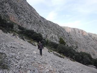 Llegados a este punto, después de los últimos árboles, giramos a la izquierda en horizontal buscando el arbolito que se ve en frente, que es donde empezaremos la trepada de IIIº para superar el espolón...